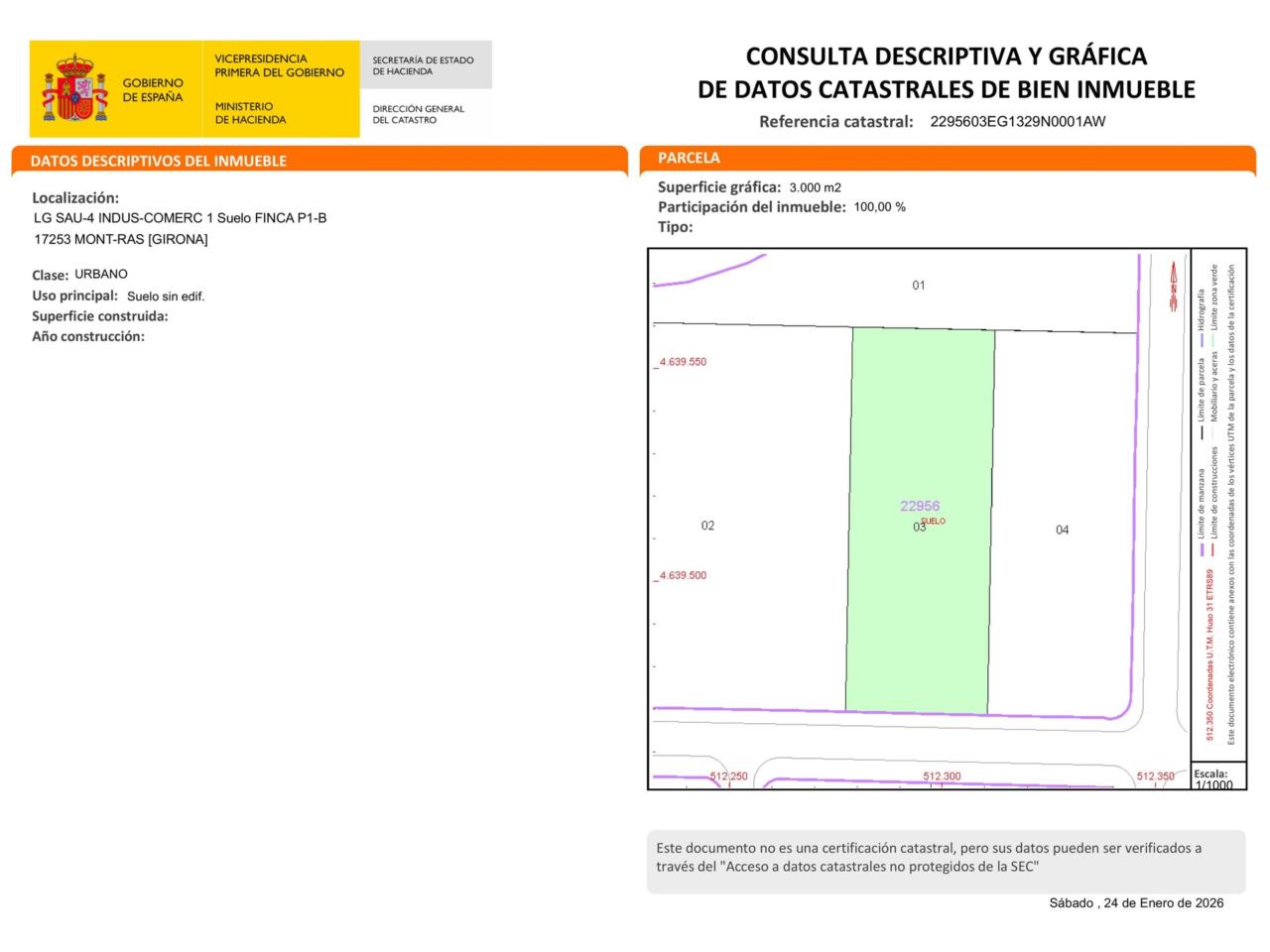 DescripciónTerreno 1C de 3013,14 m2 ubicado en la parcela P1 del SAU 4 COMERCIAL. Emplazamiento : Plan Parcial SAU 4 , c/8 de marzo - C-31 - MONT-RAS, comarca del Baix Empordà La edificabilidad máxima es de 2.918 m2. La ocupación de 2109,19 m2. La altura de construcción es de 10 my 12 m justificables. El número de plantas es 3. Condiciones de uso: Los usos dominantes son los relacionados con el sector terciario. En estos usos están comprendidos los indicados en el artículo 13.10 del Plan Parcial del SAU 4. Estas parcelas tienen acceso directo a la red de alcantarillado ya que estas redes (pluviales y residuales) pasan por estas parcelas y tienen derecho a conexión. El resto de servicios pasan por debajo de las aceras que limitan con las parcelas y por tanto tienen acceso directo a estos servicios.
